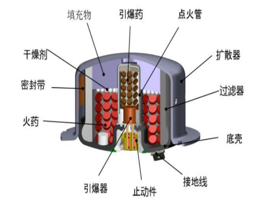 1、第一级引爆:在碰撞初期,第一级引爆器触发,点燃推进剂,产生大量氮气并迅速推开推杆,使储气罐压力迅速升高。大量氮气通过气室的通道迅速进入到气囊,使气囊开始充气。